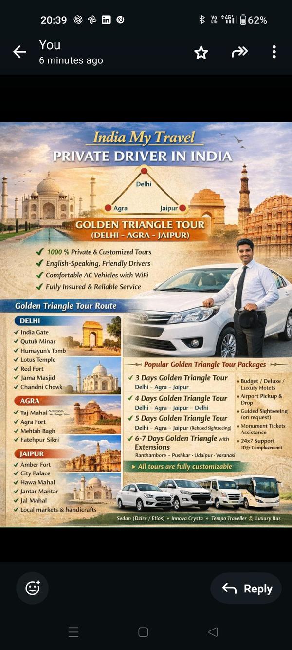 India My Travel. North India Best Travel Company India Tours Package. Best Taxi Service Tour Package. India My Travel Fleet Owner Tour Operator India Best Tour Packages Is North India Best Travel Transportation In Luxury Car Rental Delhi Delhi Taxi Rental. Tempo Travel Hire In Delhi Tourist Transport Experience Tour Package Experience 18 Years In Travel Industry We Have 2 Generation My In Family. Touch To India Travel India Best Travel Company India My Travel Packages offer 20% discount India offers a diverse range of travel experiences, from historical sites and cultural attractions to natural wonders and vibrant cities, with popular destinations including the Golden Triangle (Delhi-Agra-Jaipur), Rajasthan, Kerala, and Goa. Popular Destinations & Experiences: Golden Triangle: Explore the historical cities of Delhi, Agra (home to the Taj Mahal), and Jaipur. Rajasthan: Experience the vibrant culture, palaces, and deserts of Rajasthan, including cities like Jaisalmer, Jodhpur, and Udaipur. Kerala: Discover the 'God's Own Country' with its backwaters, beaches, and hill stations. Goa: Relax on the beaches, explore the colonial architecture, and enjoy the nightlife in Goa. Other Notable Destinations: Mumbai: India's largest city, known for its Bollywood industry and bustling atmosphere. Rishikesh: A spiritual hub and adventure destination on the Ganges River. Jim Corbett National Park: A popular destination for wildlife enthusiasts. Andaman Islands: A tropical paradise with stunning beaches and coral reefs. Kashmir: Known for its scenic beauty and winter sports. India My Travel www.indiamytravel.com +919717358692 Good Customer And Good Service Atithi Devo Bhav Namaste India